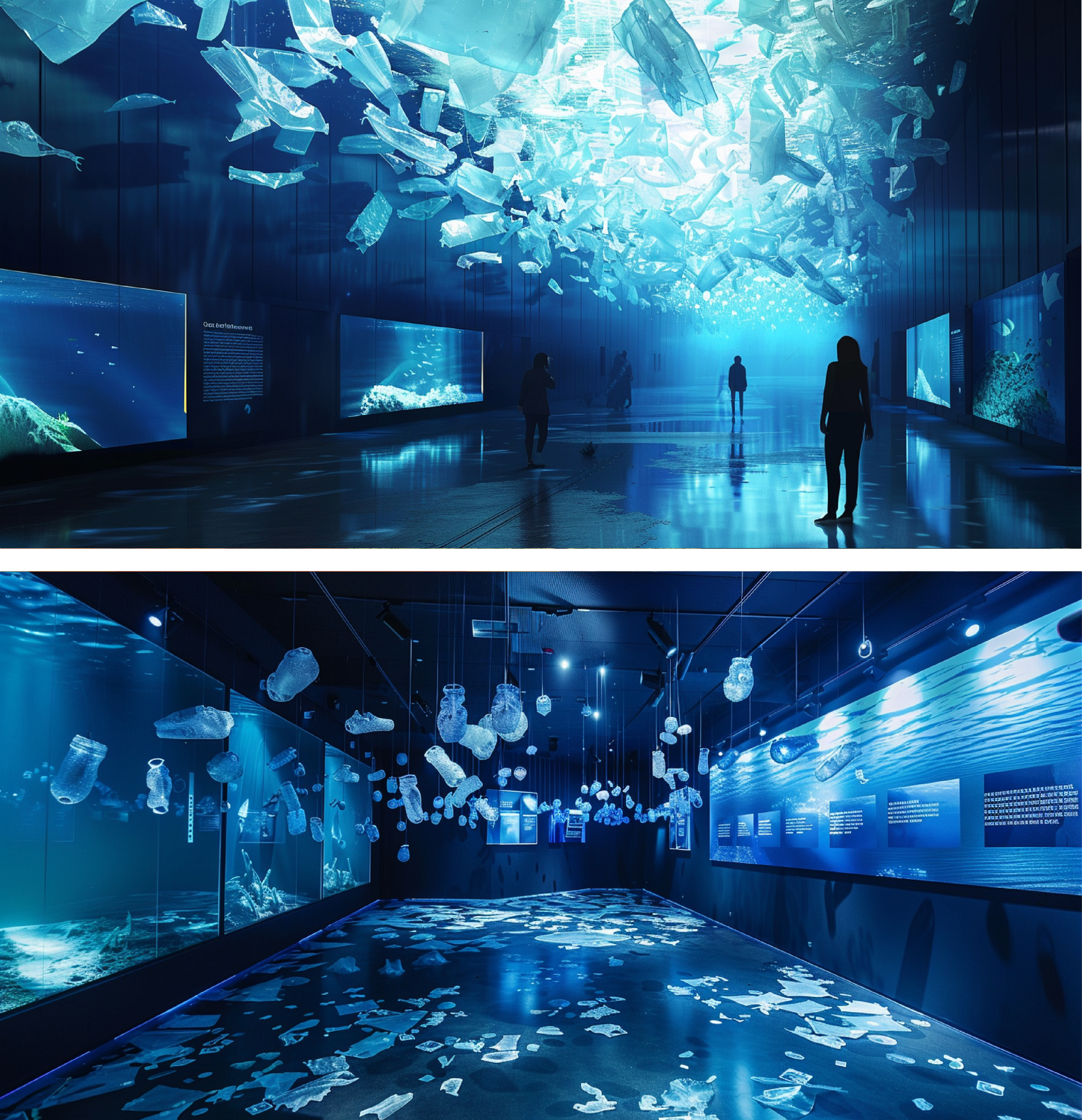 Inspired by the ocean, this exhibition reveals the hidden journey of plastic from massive drifting waste to microscopic threats. Layered visuals and immersive environments mirror the depth and complexity of marine ecosystems, exposing how pollution silently spreads through currents, habitats, and species. Just as water connects all life, this project connects data and emotion—transforming awareness into responsibility and inspiring action to protect our blue planet.